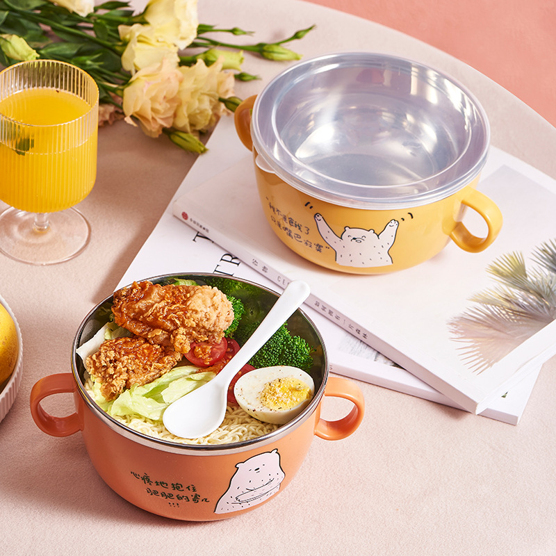 日式创意泡面碗家用卡通带盖学生个性便携保温双层不锈钢泡面碗