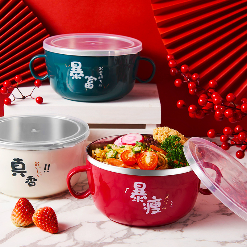 日式创意大号不锈钢泡面碗家用卡通带盖学生寝室泡面碗双层泡面碗