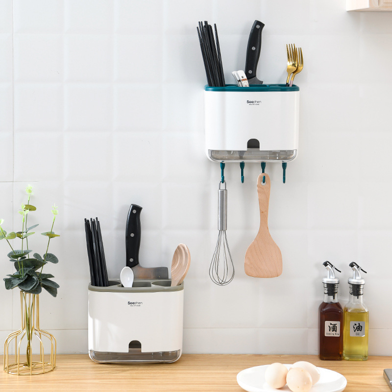 厂家直销筷笼分格式沥水简约挂钩塑料筷笼挂壁式家用餐具汤勺收纳