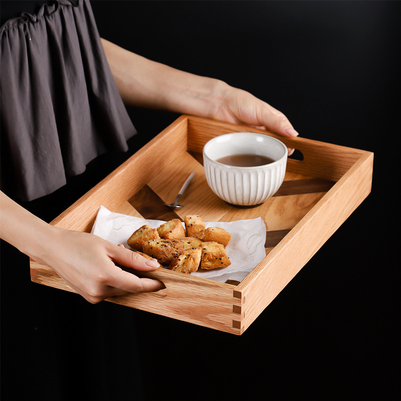 日式橡木拼花收纳托盘 实木榫卯长方形茶水点心盘 创意提手上菜盘