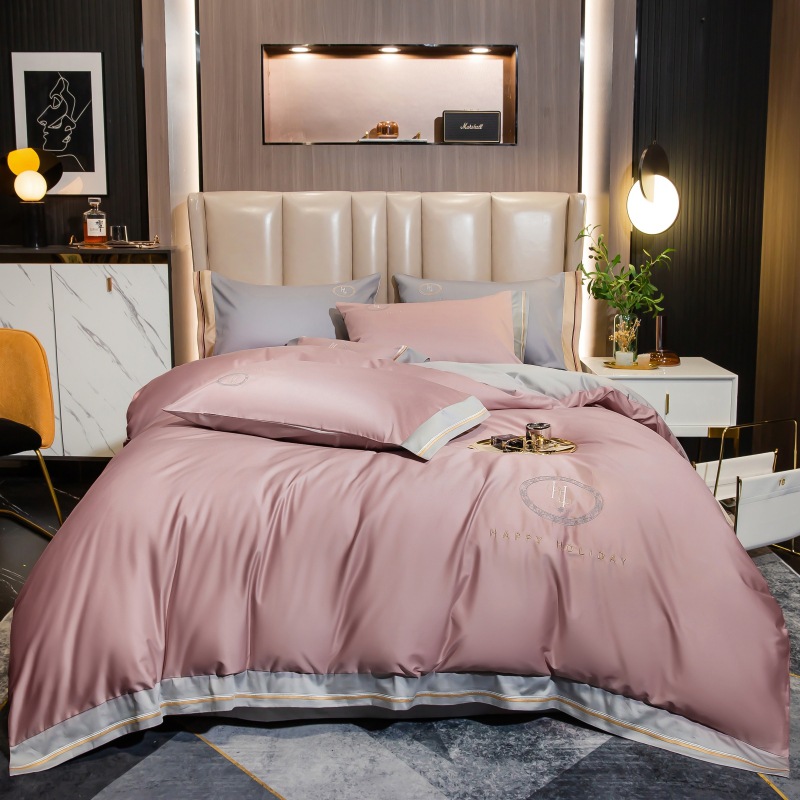 简约纯色100s贡缎长绒棉绣花四件套撞色棉北欧床上用品厂家批发