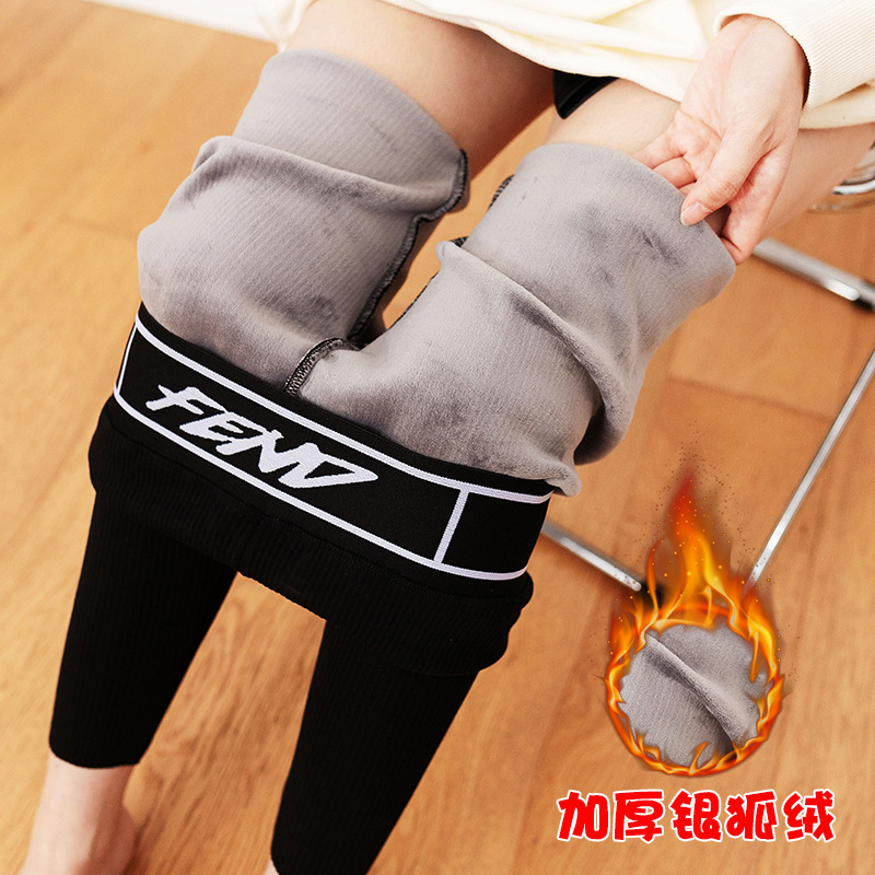 2021秋冬高腰打底裤女外穿加绒加厚网红字母腰保暖紧身小脚裤批发