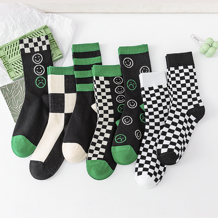 潮牌东大门黑白经典棋盘格棉袜子 潮流情侣运动男女绿色笑脸袜子