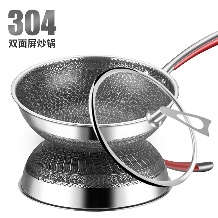 礼品批发304不锈钢三层平底锅双面屏蜂窝不粘锅炒菜锅电磁炉炒锅