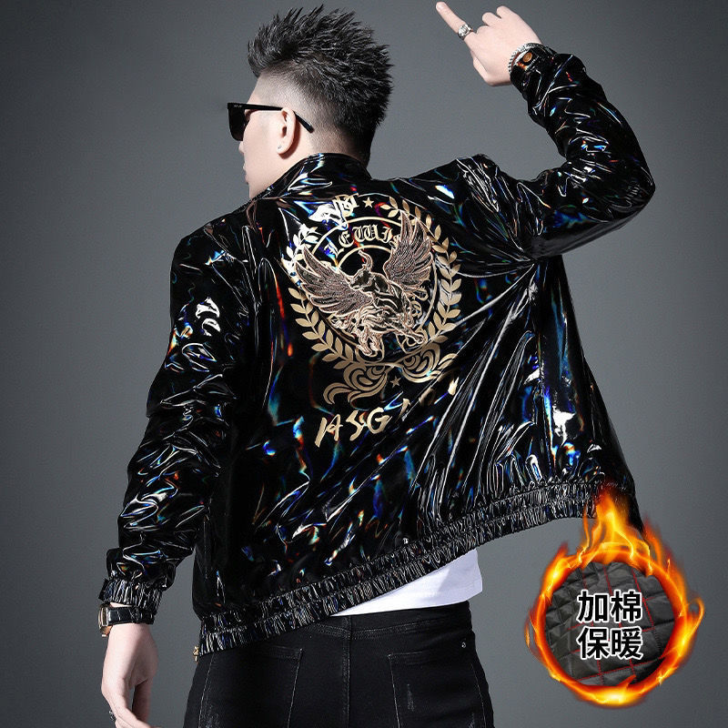 欧货秋冬加棉加厚夹克棒球服现货拉链时尚个性免烫外穿烫金夹克男
