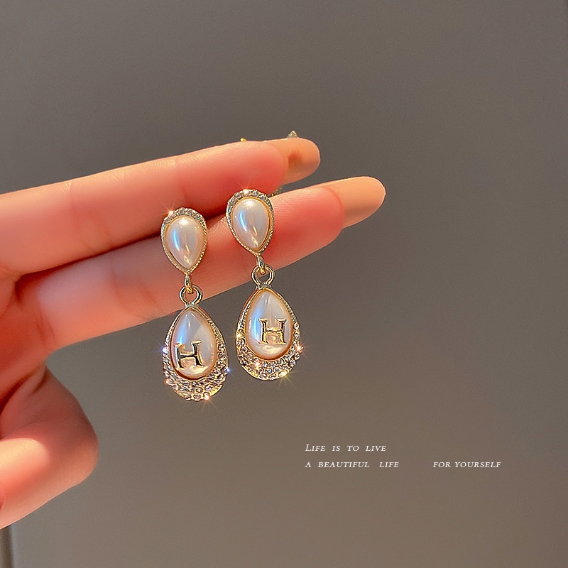 新款高级感水滴珍珠显脸瘦字母H耳环 气质简约镶钻水滴珍珠耳饰女
