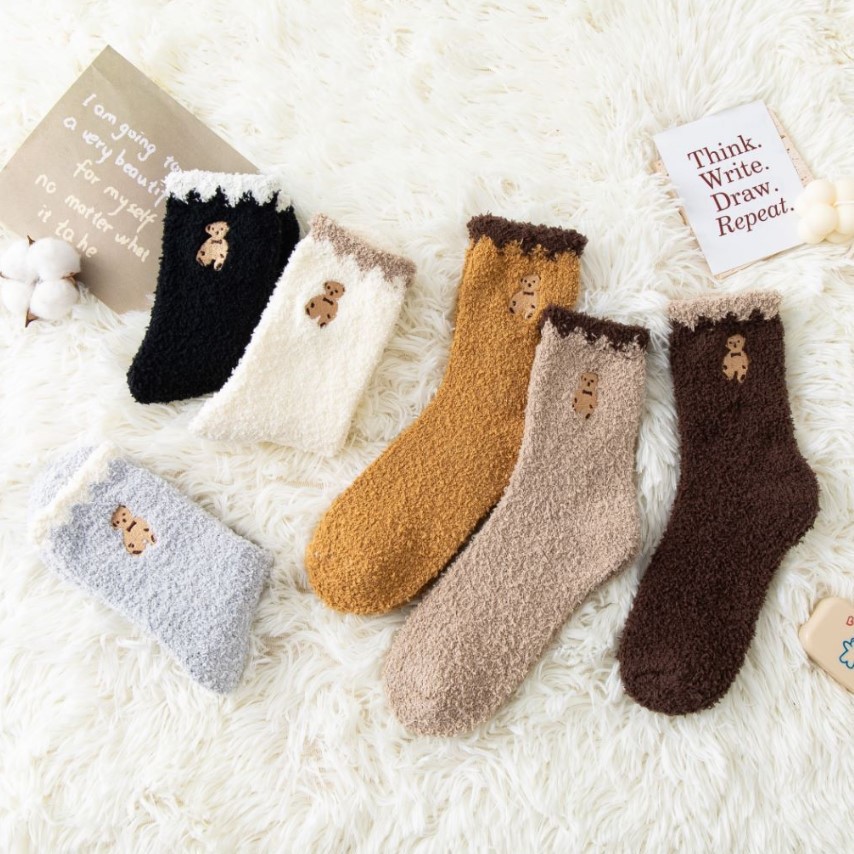 日系女士刺绣卡通小熊半边绒袜地板袜 珊瑚绒袜加厚保暖毛巾袜