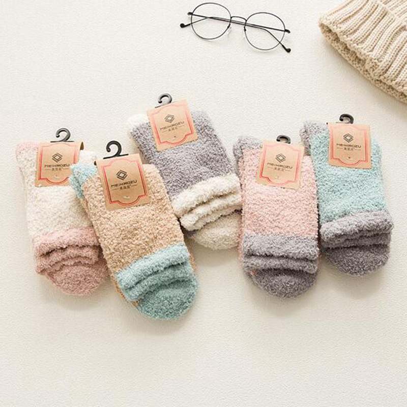 保暖珊瑚绒袜子不掉毛女士加厚睡眠地板袜中筒扎口半边绒袜休闲