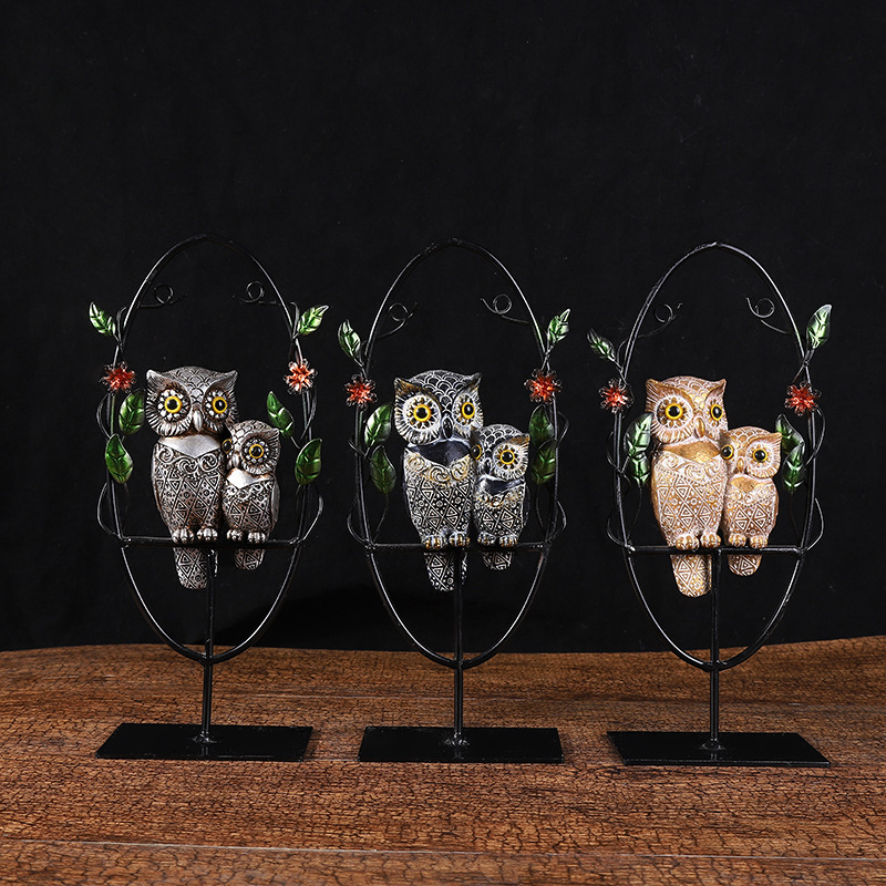 跨境直供 创意子母猫头鹰树脂工艺品金属架子摆件 客厅书房摆件