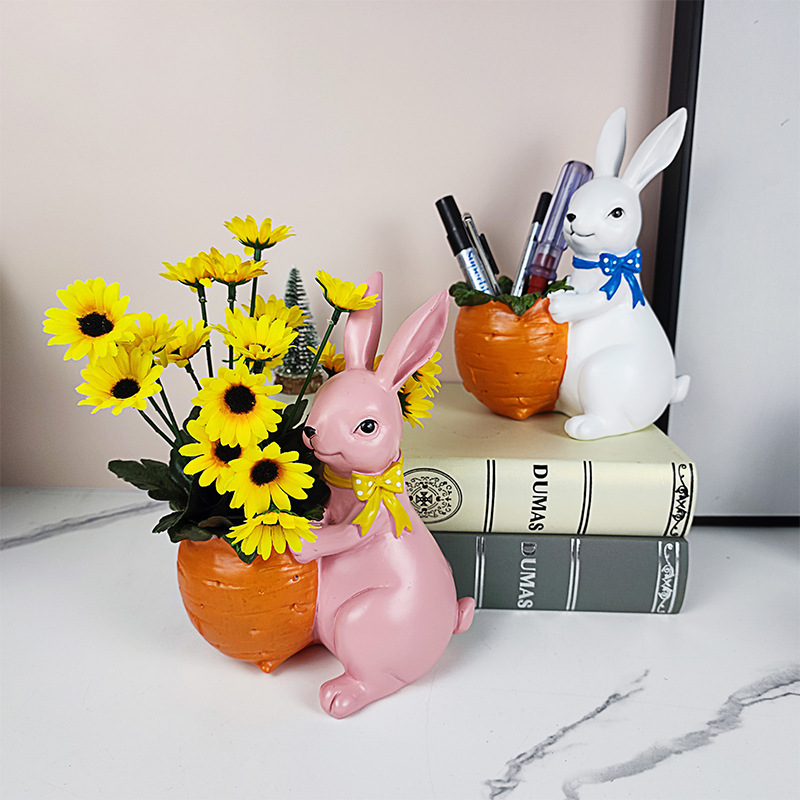 创意兔子笔筒摆件田园树脂工艺品家居客厅装饰品办公室桌面收纳桶