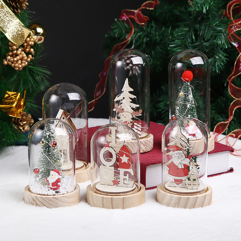 圣诞节玻璃罩暖色LED灯摆件 迷你圣诞微景观木制玻璃