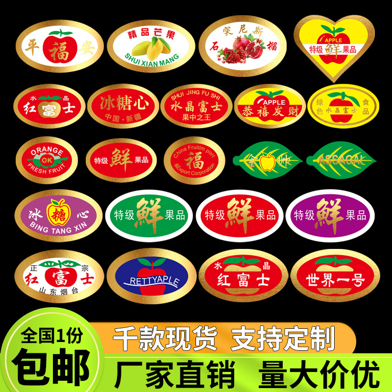 高档烫金橙子梨芒果香蕉石榴水果不干胶标签商标苹果标签贴纸