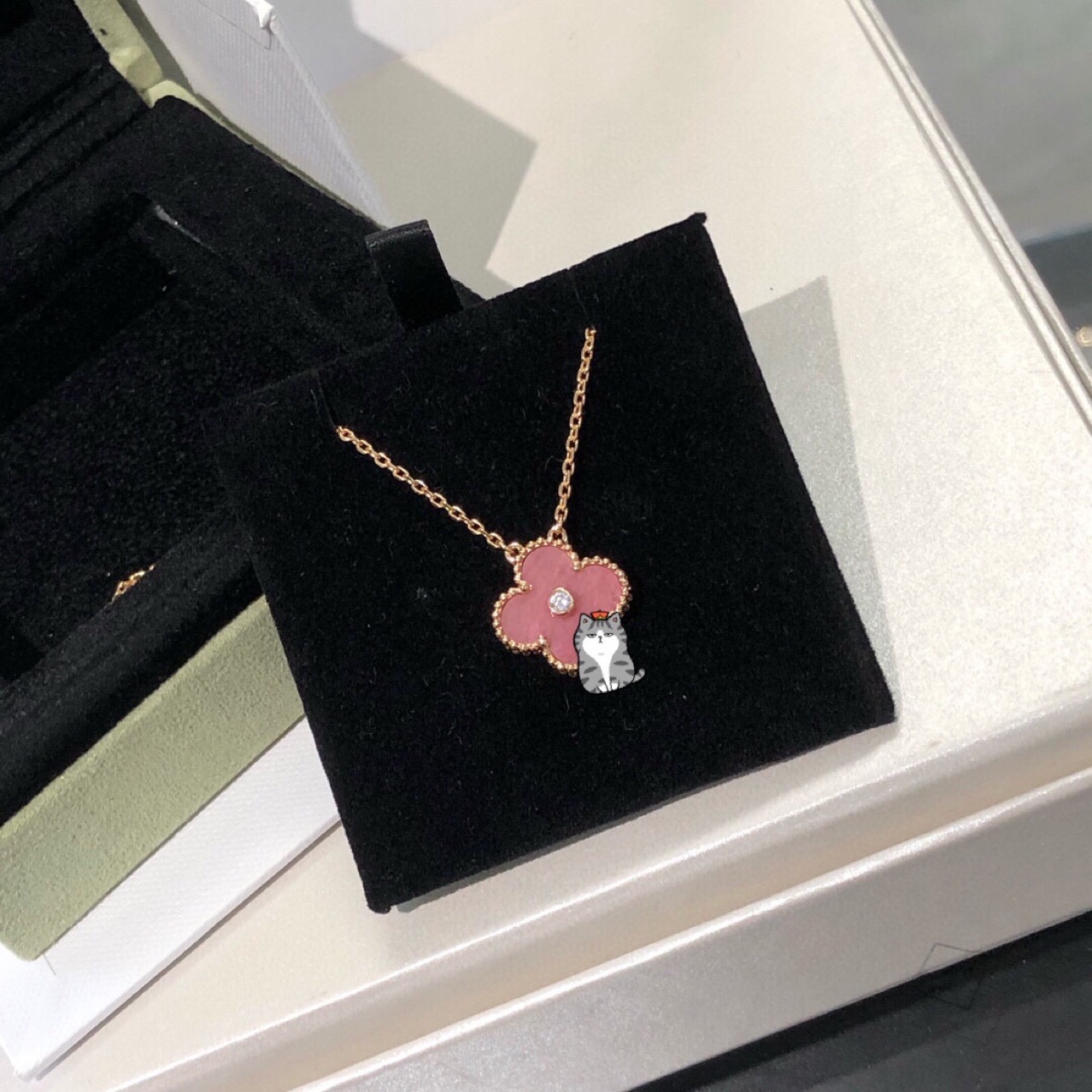 18K金厚镀 VC家圣诞限量款蔷薇石四叶草项链 蔷薇辉石CNC高