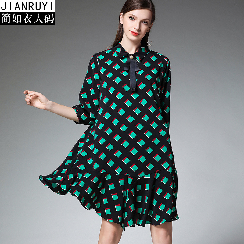 欧美大码女装胖mm2021春秋新款连衣裙格子雪纺中袖裙子批发7190