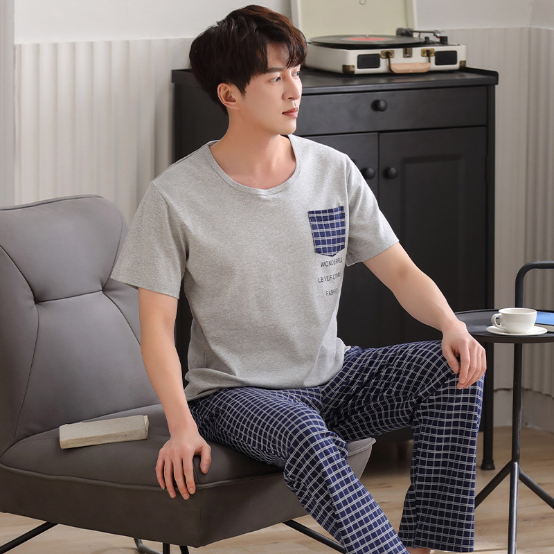 男士睡衣短袖长裤新款夏季全纯棉纯色可外穿家居服套装批发88983