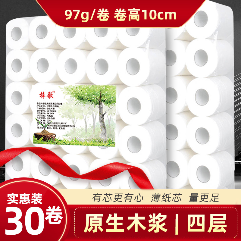 空芯卷卫生纸原生木浆卫生间厕所卷筒纸手纸4层压花30卷批发包邮