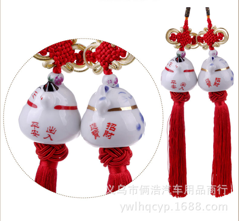 红色中国结招财猫彩陶瓷汽车挂件 招财保平安