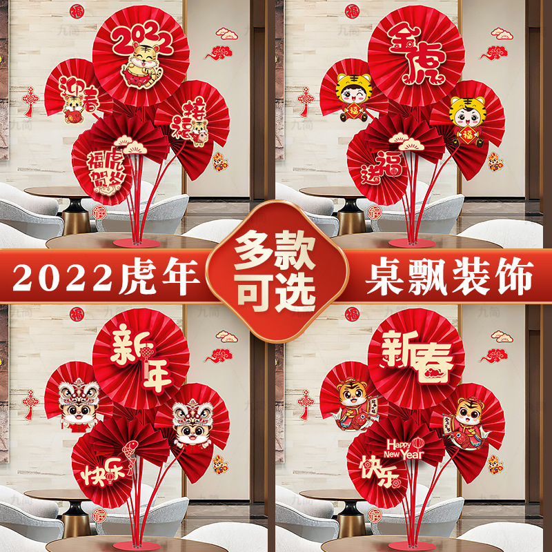2022虎年创新生肖纸扇花桌飘卡通地飘新年春节装饰年货福字摆件