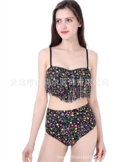 2018新款高腰比基尼 锦纶印花显瘦小碎花流苏比基尼 BIJINI好卖款