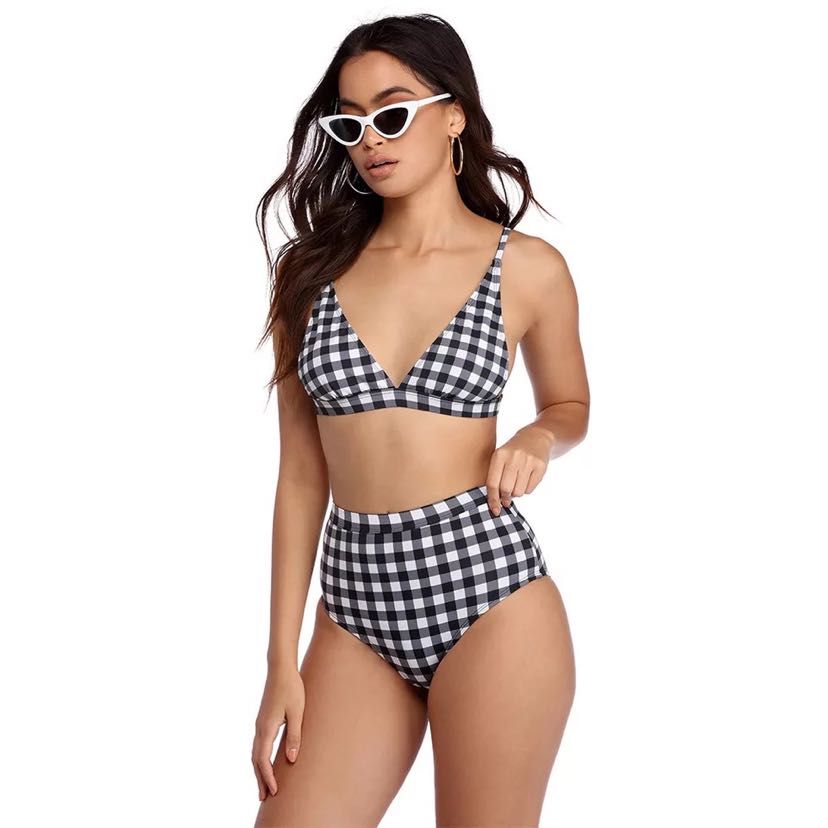 比基尼外贸新款性感格子印花高腰女士分体泳衣锦纶品质厂家直销