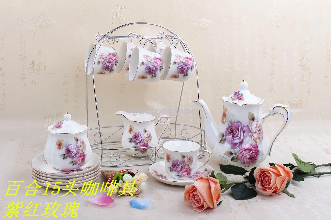 2018新款15头朵花咖啡具茶具套装带铁架咖啡杯陶瓷壶