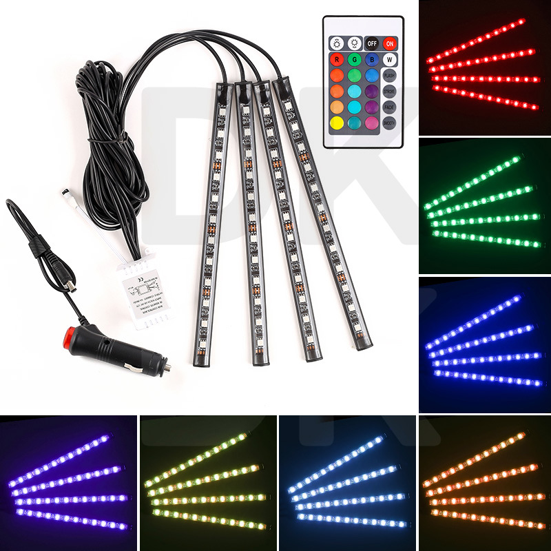 源头批发汽车9LED车内装饰氛围灯七彩RGB一拖四脚底气氛灯外贸