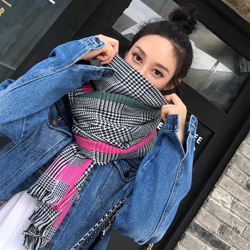 2018千鸟格围巾女秋冬季欧美新款英伦格子仿羊绒百搭加厚披肩围脖