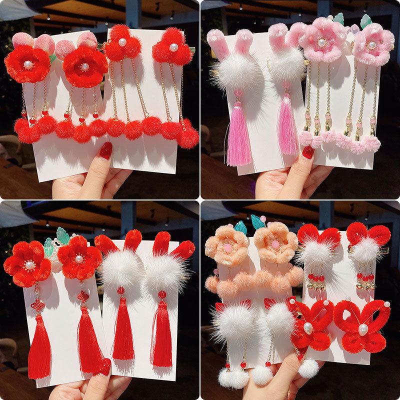中国风流苏发饰儿童花朵古风发夹女童汉服大红毛球发卡子复古头饰