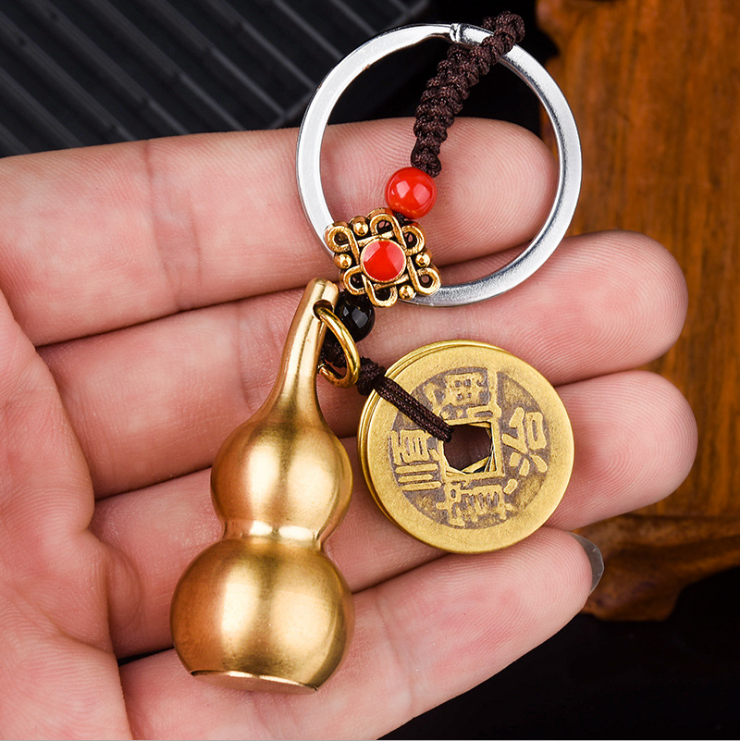 中国风五帝钱汽车钥匙扣开光黄铜葫芦挂件空心实心福禄吊坠包挂饰