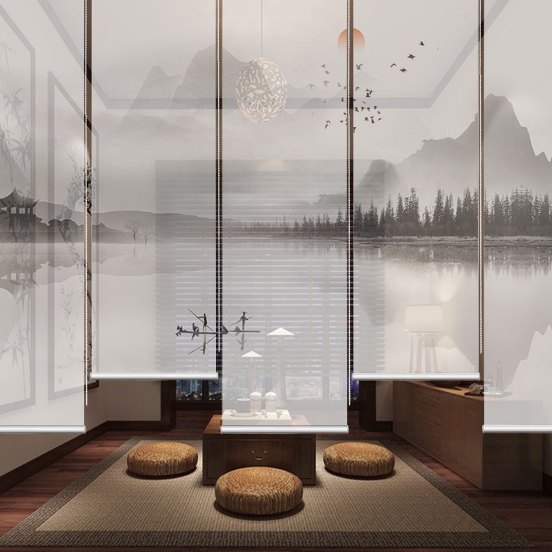 新中式窗帘卷帘山水装饰中国风升降客厅玄关遮光手拉电动隔断屏风