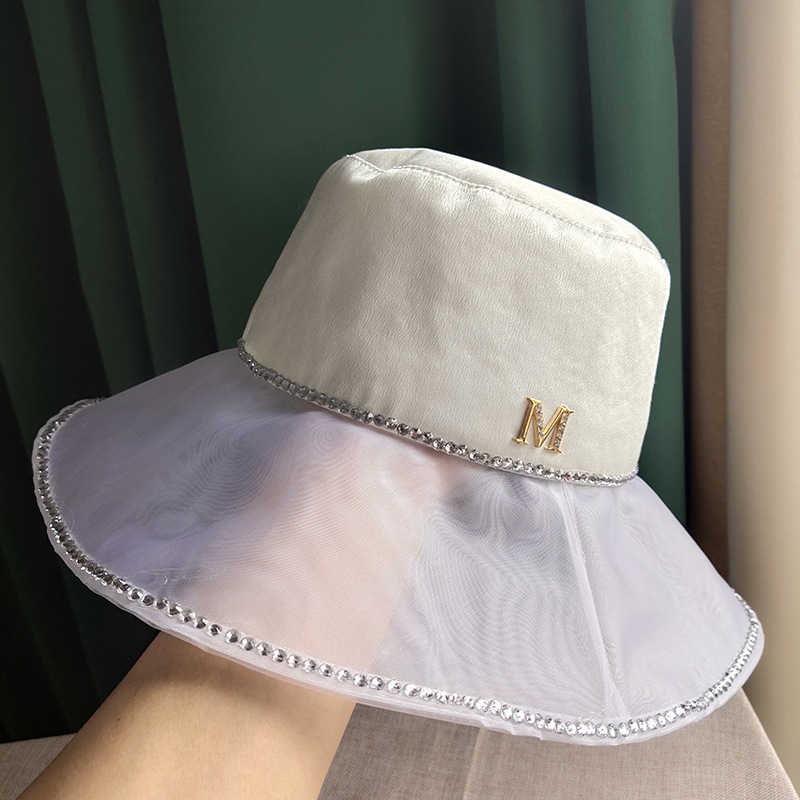 日系时装帽子欧美小香风丝光水钻M标遮阳盆帽网红仙女网纱渔夫帽