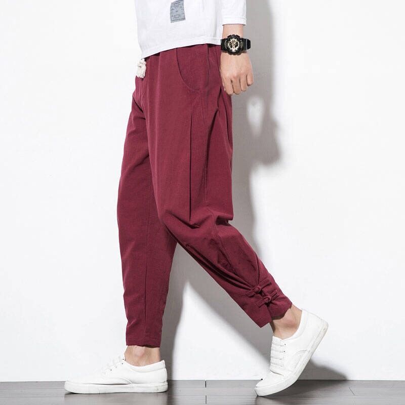 中国风裤子男宽松亚麻长裤哈伦灯笼裤男士宽松盘扣小脚棉麻休闲裤