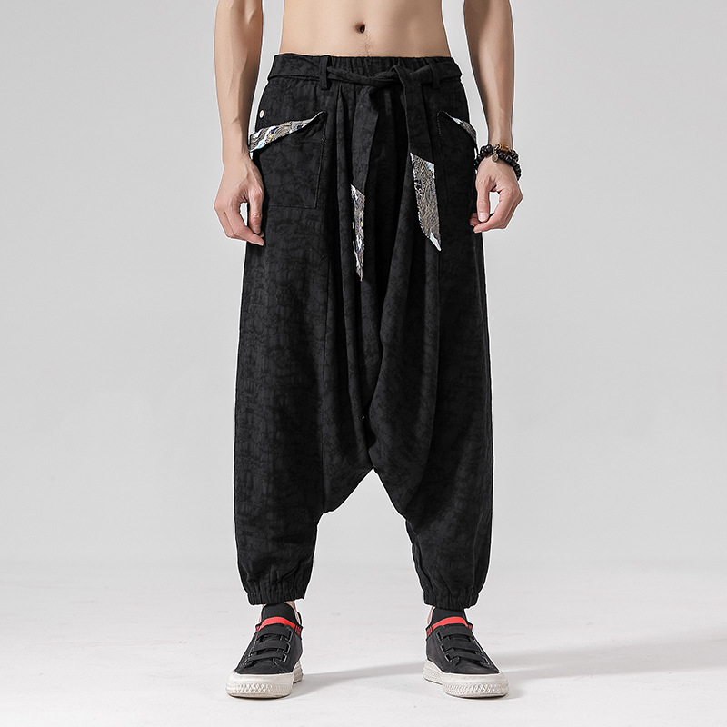 2021年秋冬新款裤子男士中国风唐装哈伦裤棉麻腰带拼接潮流吊裆裤