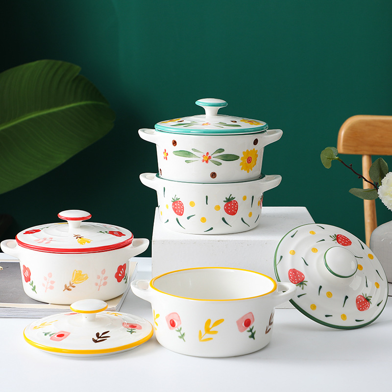 陶瓷创意水果沙拉碗可爱甜品碗炖汤盅带盖家用蒸蛋烘焙碗双耳烤碗