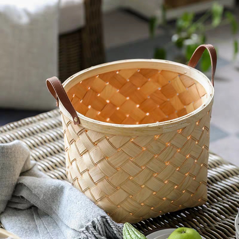 日式木编收纳桶编制杂物筐简约收纳篮大号零食筐脏衣桶水果采摘篮