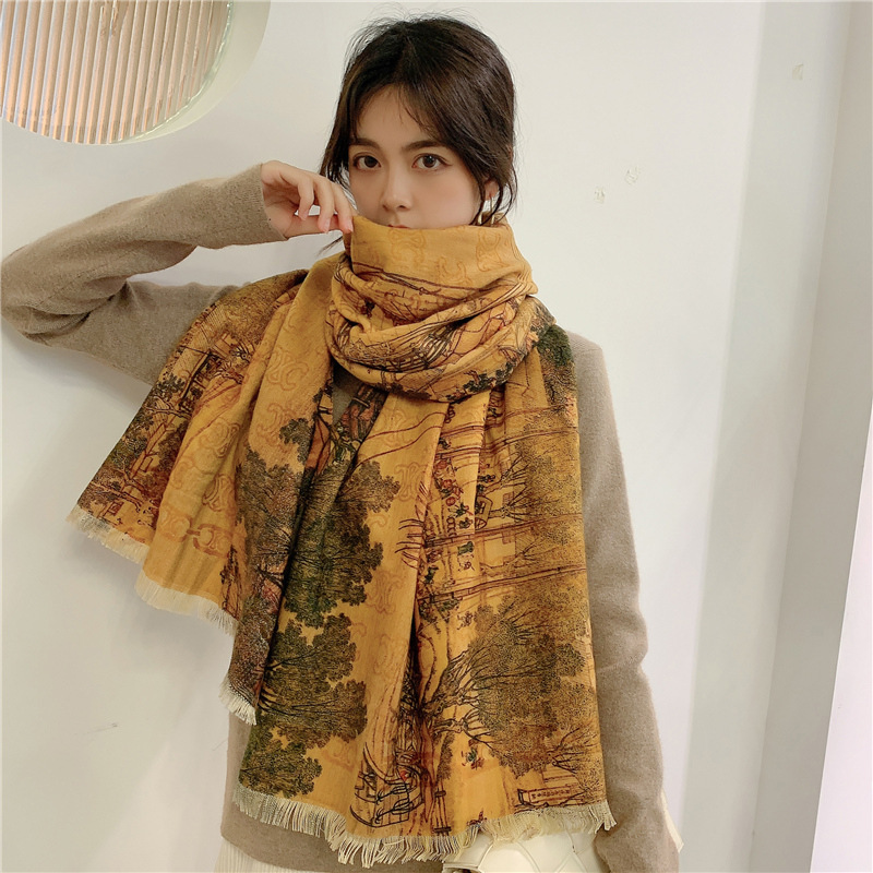 新款中国风围巾仿羊绒清明上河图女士披肩加长加厚百搭围巾批发