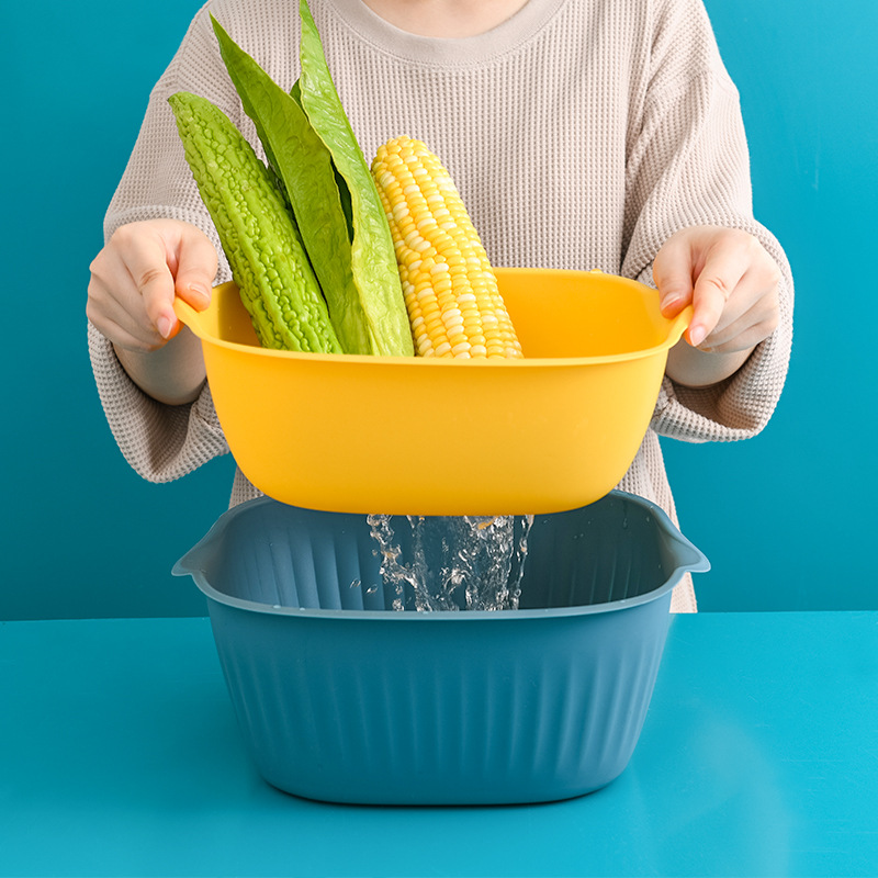 2750双层洗菜盆沥水篮家用方形洗水果盆厨房塑料果盘蔬菜收纳筐