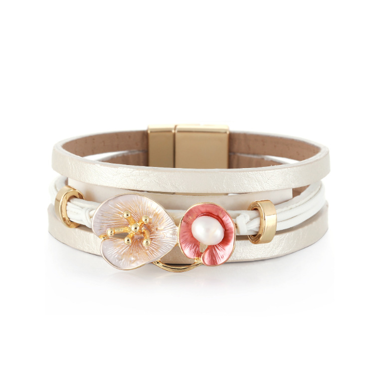 中国古风新款复古皮革手镯 几何花朵珍珠优雅磁扣女手环厂家批发
