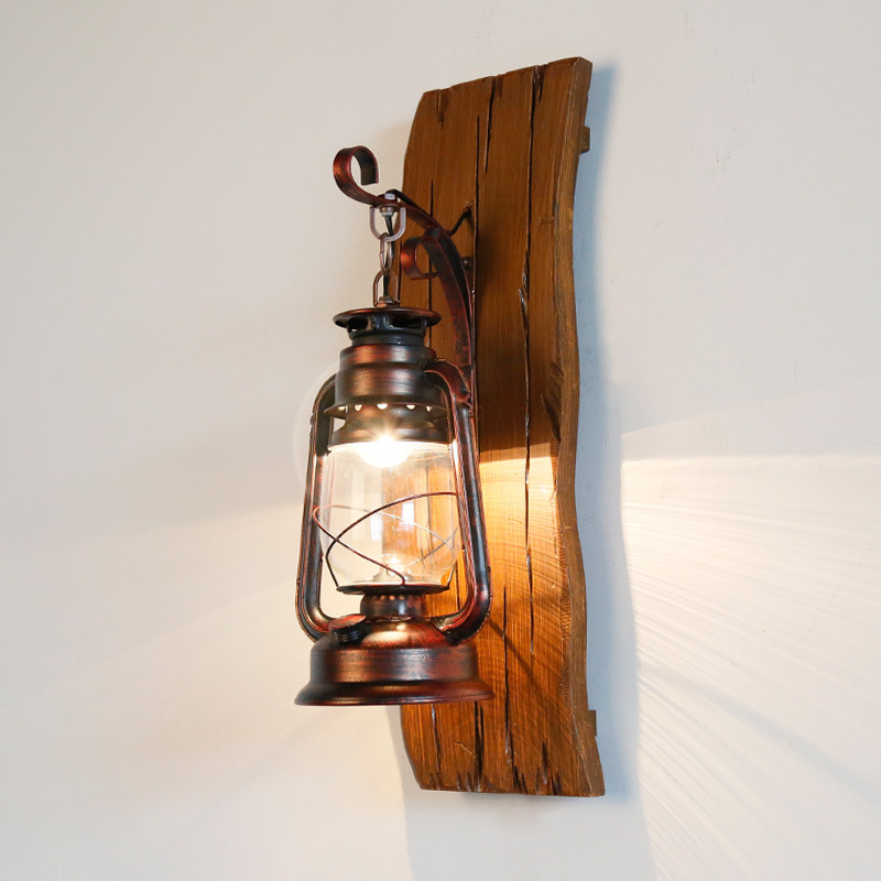美式乡村壁灯铁艺煤油灯马灯创意木艺手工雕刻地中海仿古玻璃